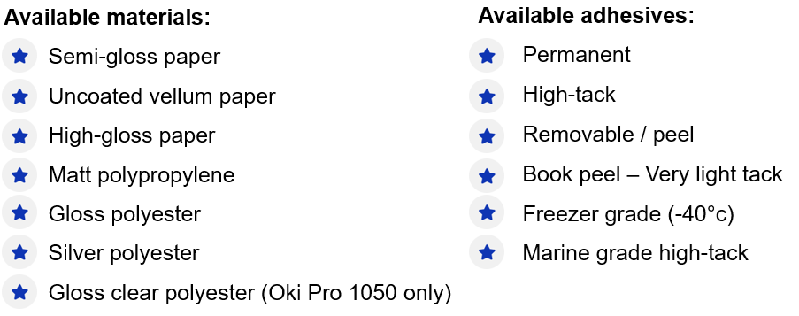 The OKI Pro printers can produce labels in an array of different methods to suit your brand and gives you the added bonus of producing your own labels to tweak at will. Our label materials are available as matt, semi-gloss or gloss, giving you the option of different finishes. |